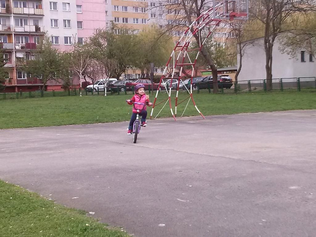4. w niedzielę, 6 kwietnia udało jej się opanować jazdę po gładkich nawierzchniach w stylu asfalt na boisku do koszykówki. Pękałam z dumy. Miała problemy z ruszeniem i zatrzymaniem się, przewracała się, gdy trzeba było skręcić, ale i tak byłam wpatrzona w nią, jak w obrazek.